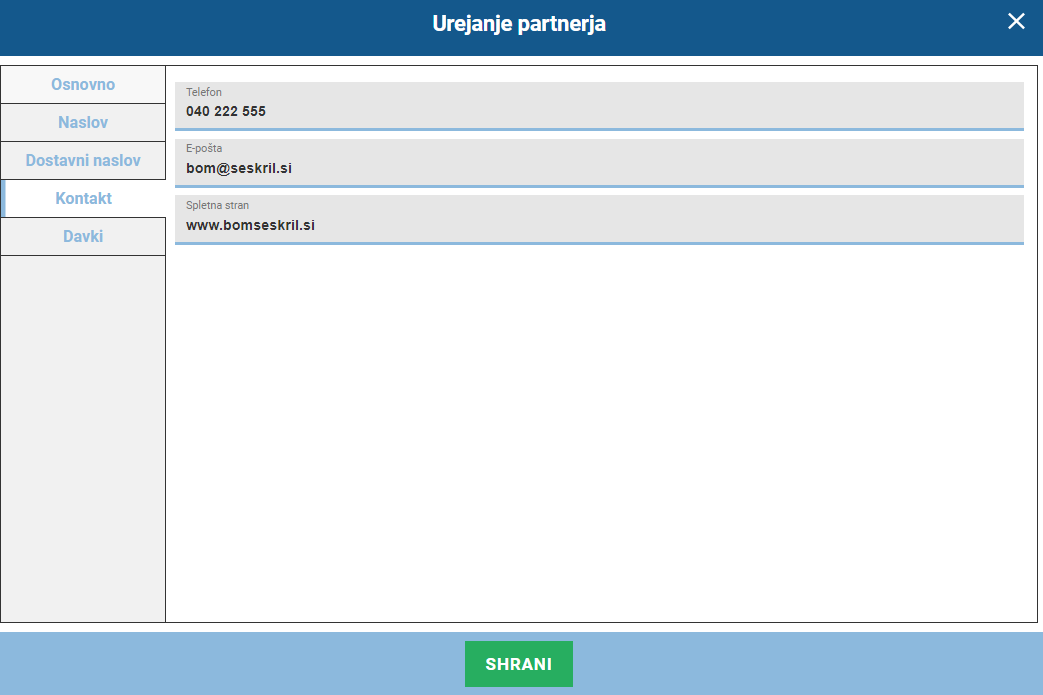 Tu shranimo podatke kot so telefon, e-pošta in spletna stran partnerja.