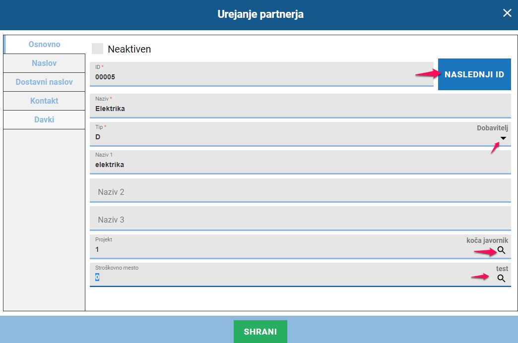 Vnos novega partnerja v zavihku osnovno vpišemo ID partnerja.partnerja. Puščica desno nam prikazuje ukaz ki nam ponudi naslednjo prosto zaporedno številko IDja. Naziv partnerja, tip izberemo iz seznama ki ga odpremo na oznaki nad puščico desno. Ponudi nam možnosti plačnik, dobavitelj, oboje. Nazivi partnerjev lahko dopolnimo z dodatnimi nazivi 1, 2, 3. Projetk na katerega se veže partner izberemo iz seznama ki nam ga odpre lupa na koncu vrstice. Postavi nas v seznam ID iz šifranta projektovprojektov.