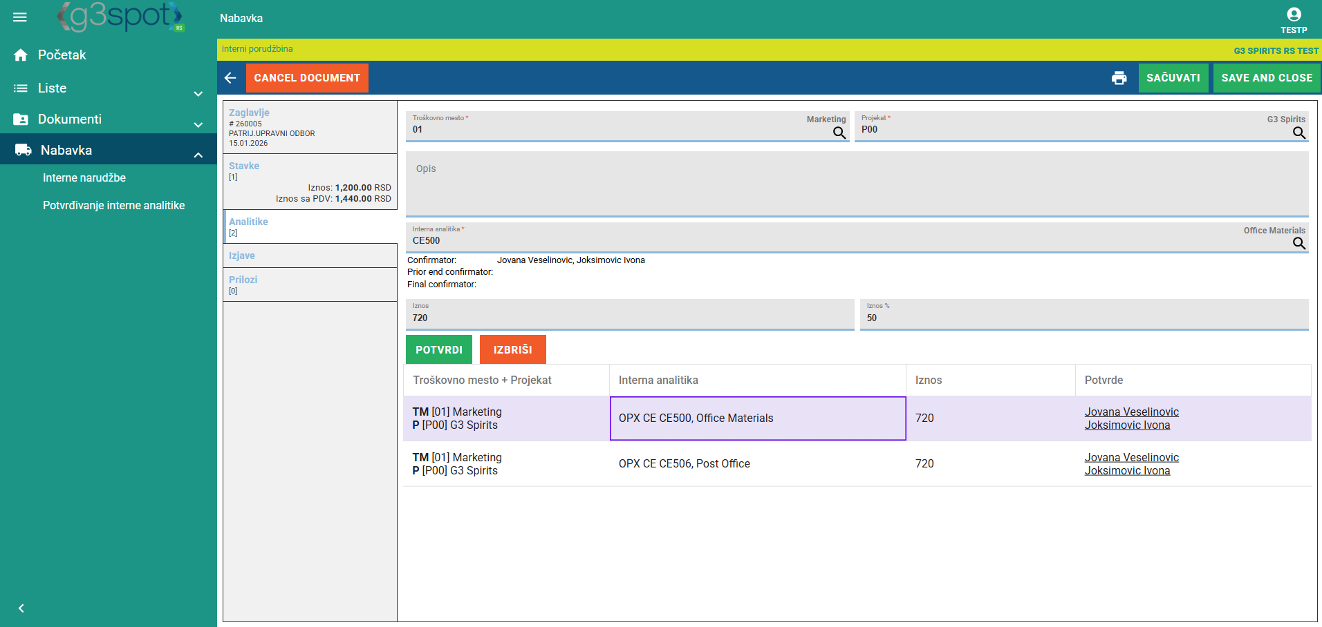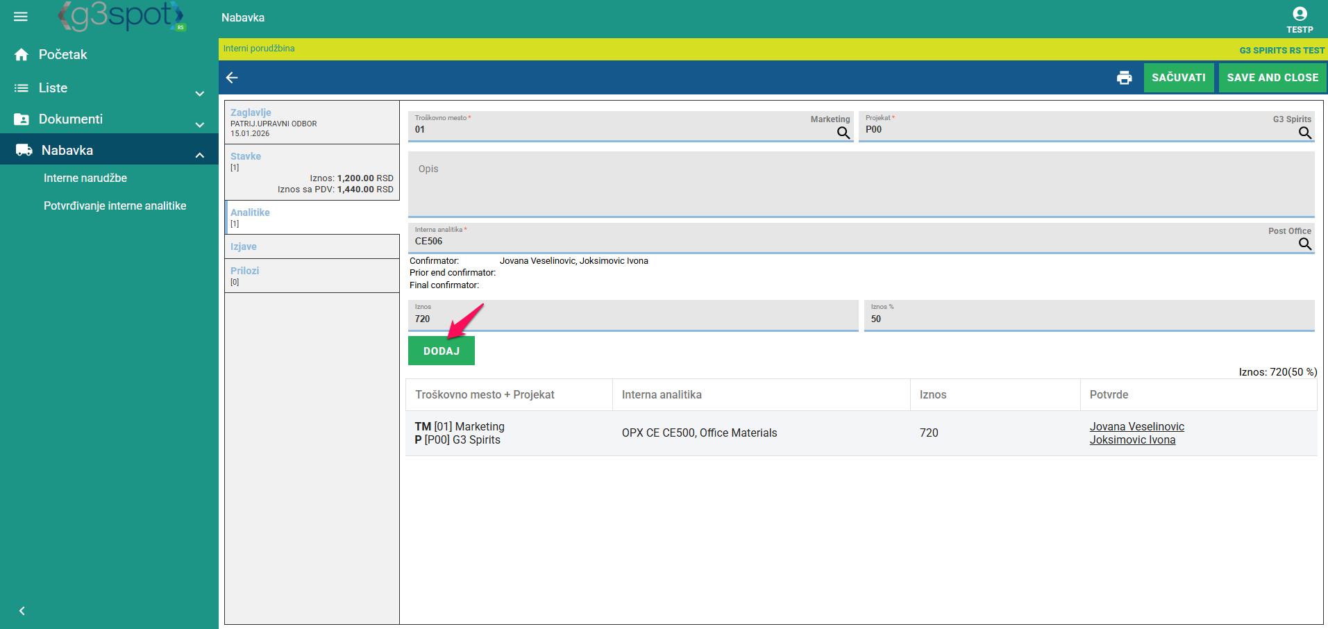 Svaka analitika počne sa unosom troškovnog mjesta i projekata - branda/marke. Dodaje se opis. U sljedećem koraku odabiremo internu analitiku koja je odgovarajuća za tu narudžbenicu. Na jednoj narudžbenici može biti više različitih internih analitika, , ali zbroj svih ne smije premašiti neto iznos narudžbenice. Ispod interne analitike prikazuju se osobe za potvrdu. One također moraju potvrditi analitiku.