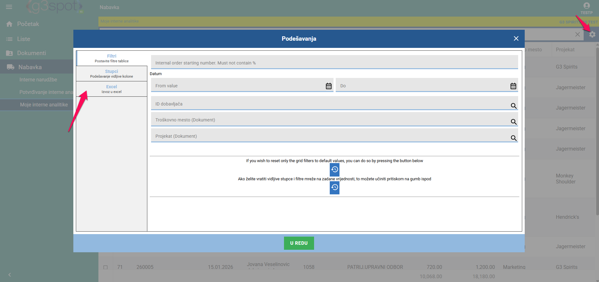 Pod ikonicom zupčanika imamo mogućnost uređivanja pregleda prema postavljenom filtru. Na sledećem tabu možemo podesiti kolone koje želimo da budu vidljive ili ne. Također imamo mogućnost izvoza u Excel, gdje možemo obrađivati podatke.