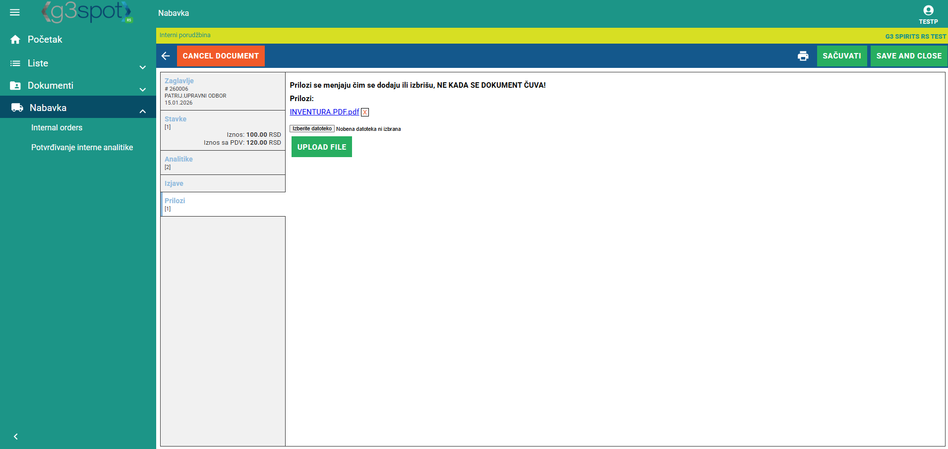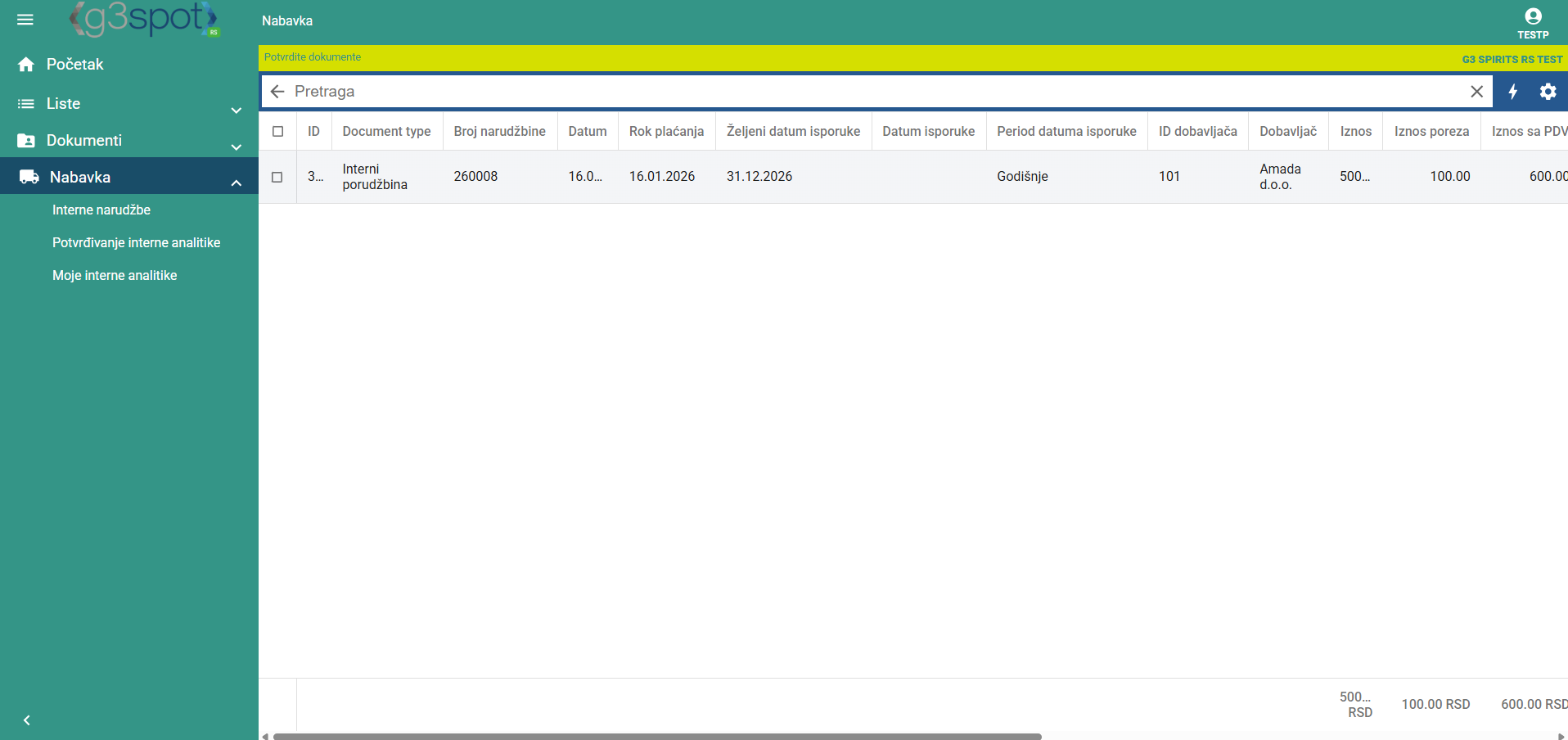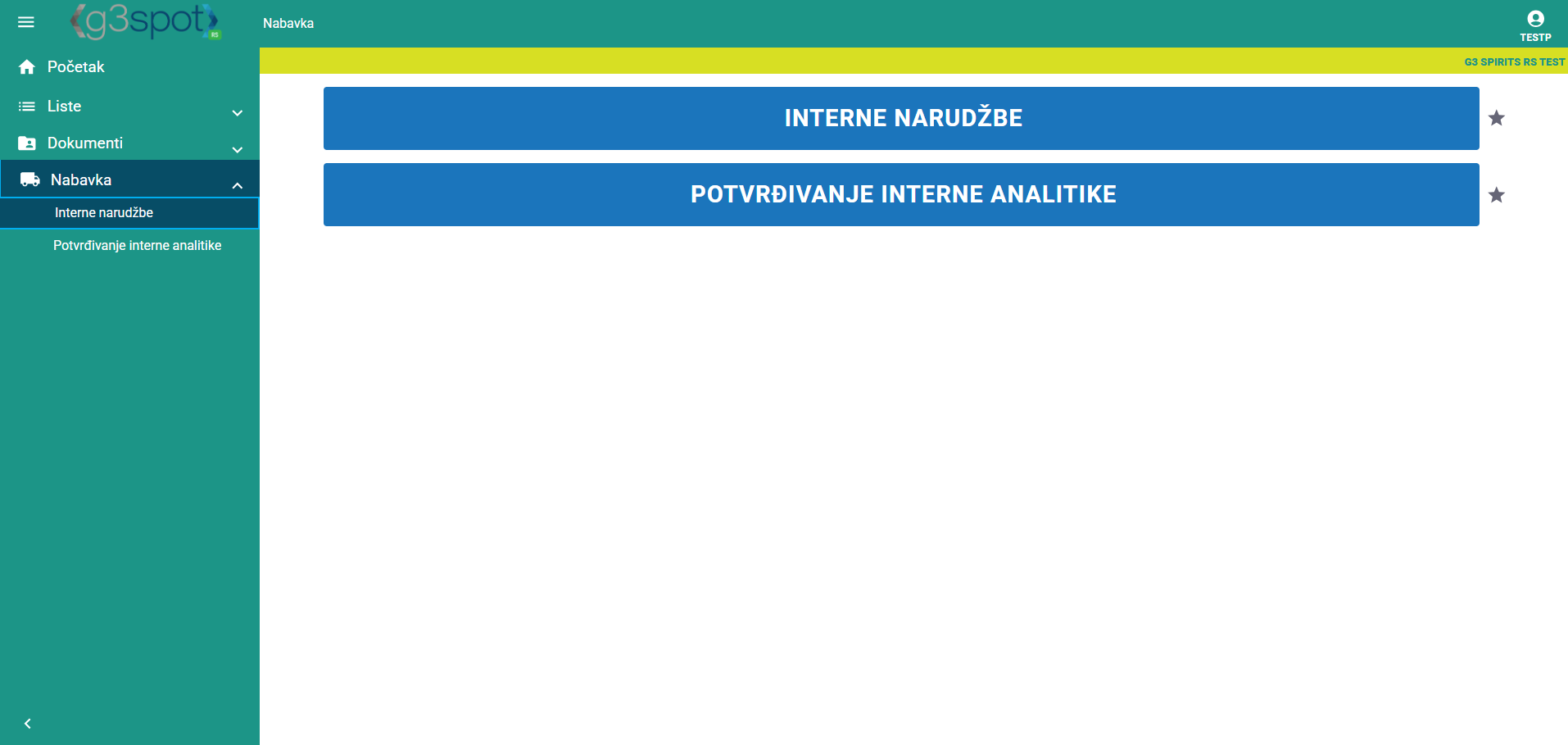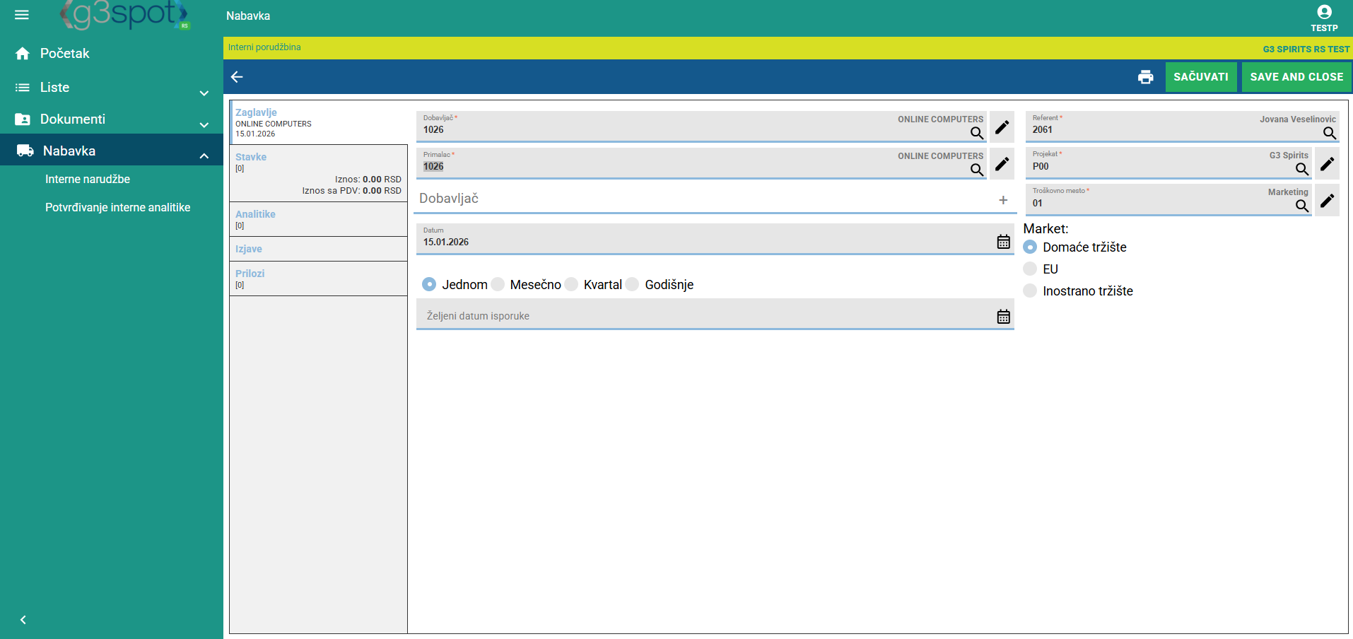 Kada se prijavimo u SPOT, imamo mogućnost unosa interne narudžbe.