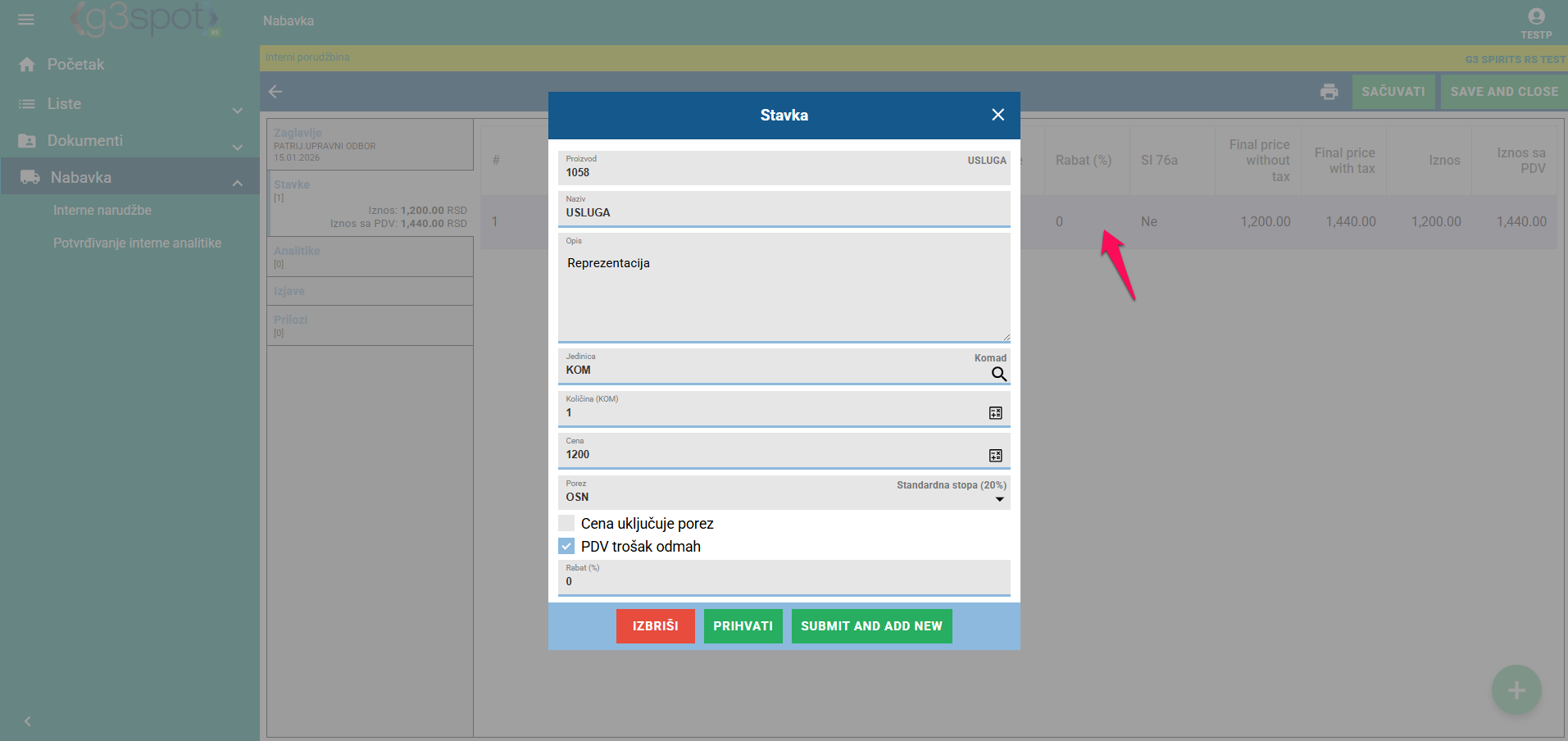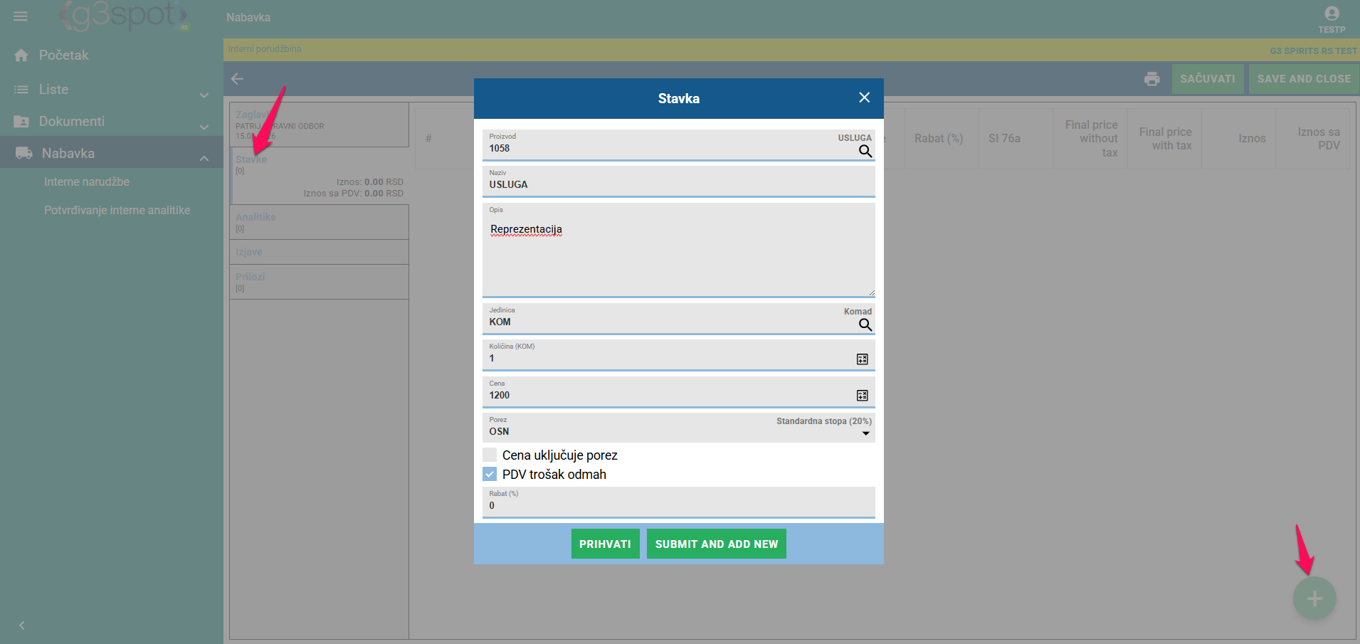 Klikom na Dodaj stavka se unosi.