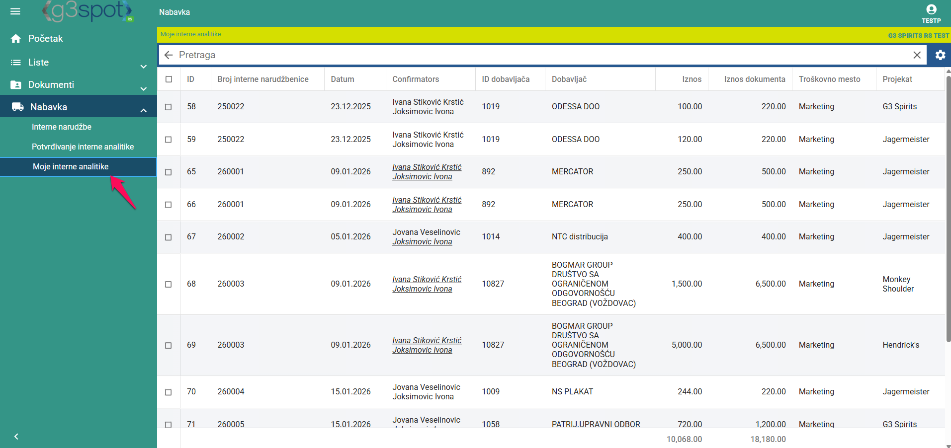 Svaki korisnik vidi samo one narudžbenice koje je on unio. Analitike korisnik može sam ispraviti, ali samo dok one još nisu potvrđene.