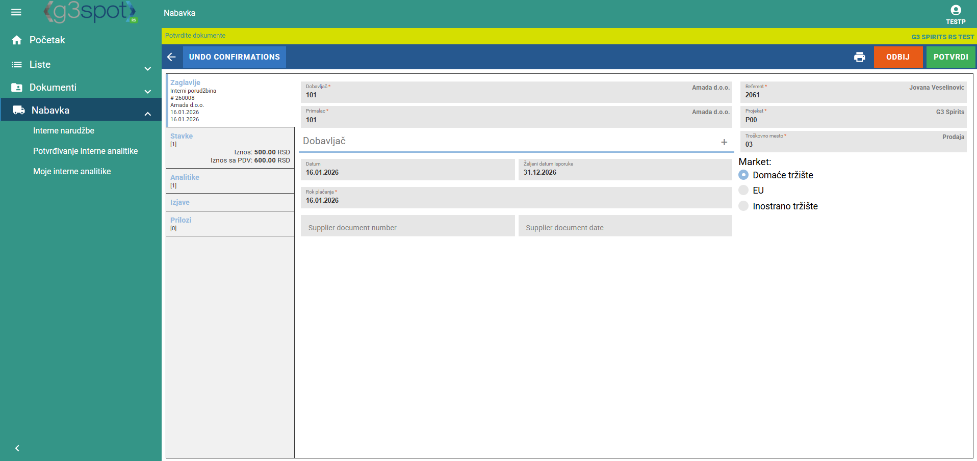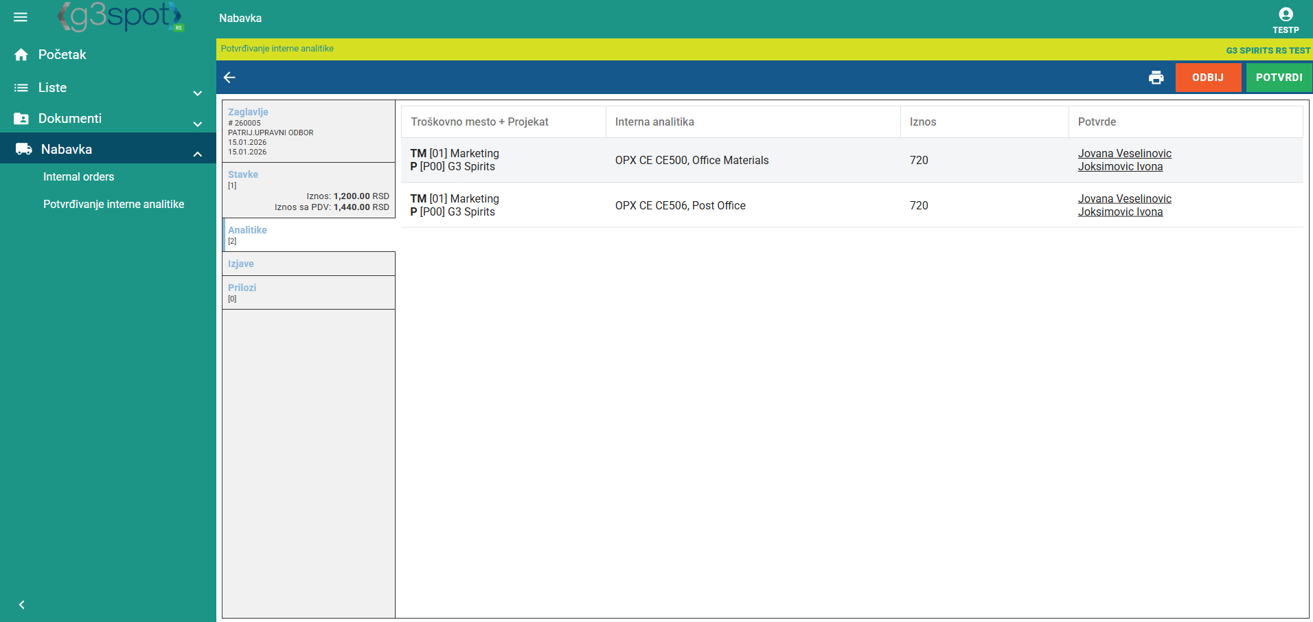 Klikom na red interne analitike prikazuju se svi podaci unešene interne narudžbenice. U gornjem desnom kutu pojavljuju se dva gumba: Odbij i Potvrdi. Klikom na Odbij interna analitika se odbija, a klikom na Potvrdi se odobrava.