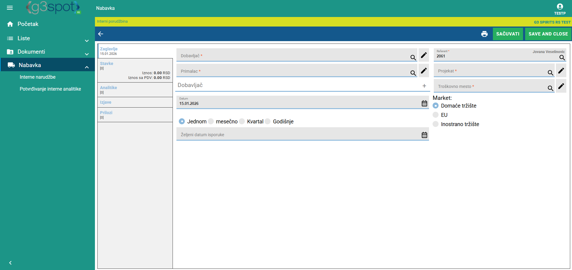 Kada se prijavimo u SPOT, imamo mogućnost unosa interne porudžbine.narudžbe.